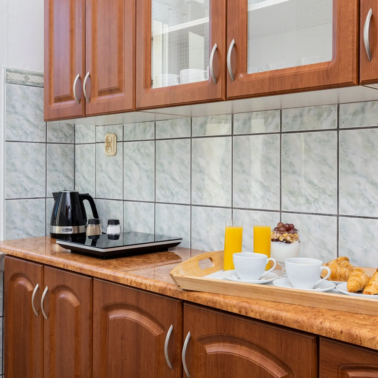 • Kuchnia: płyta, lodówka, czajnik, przybory kuchenne